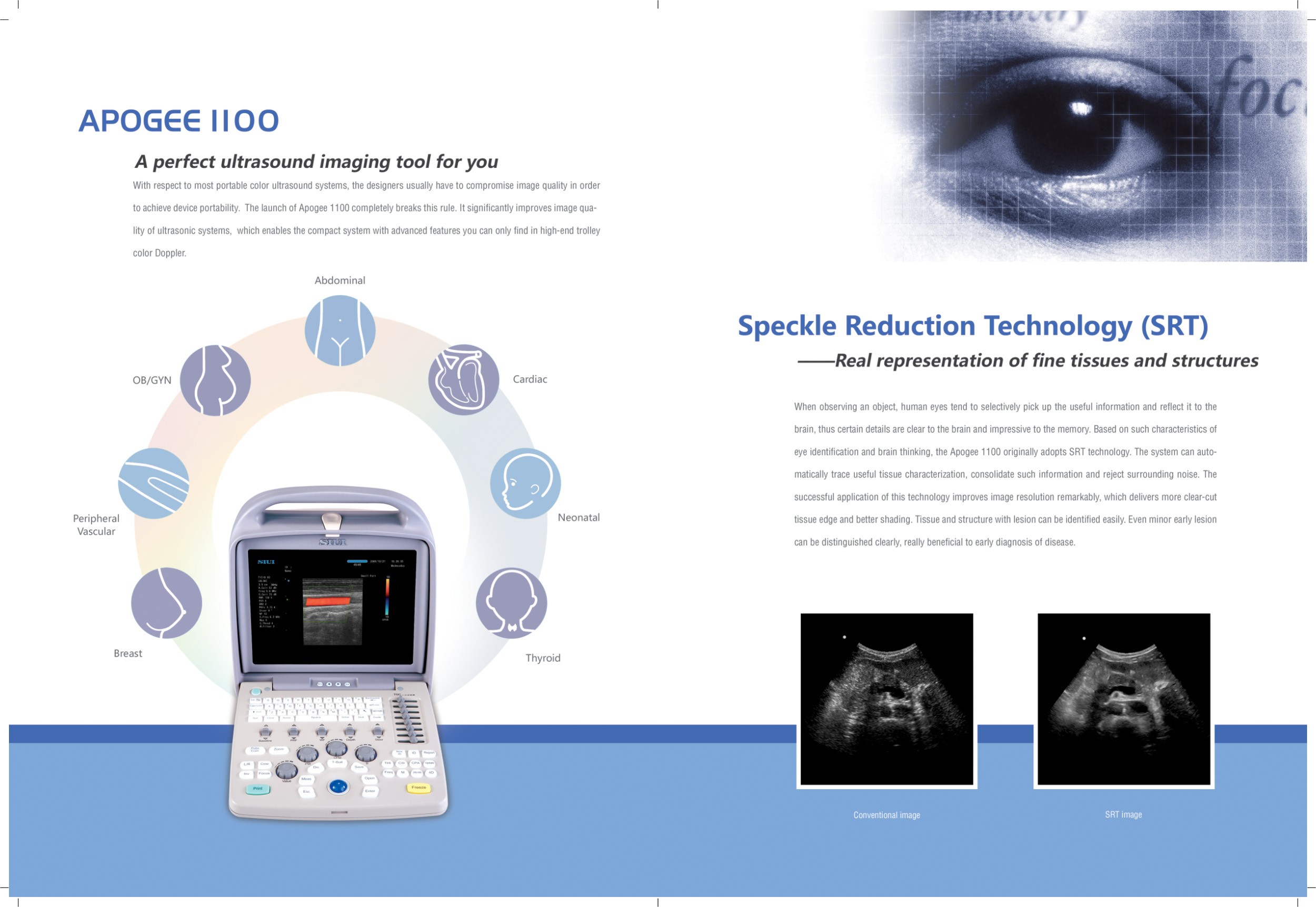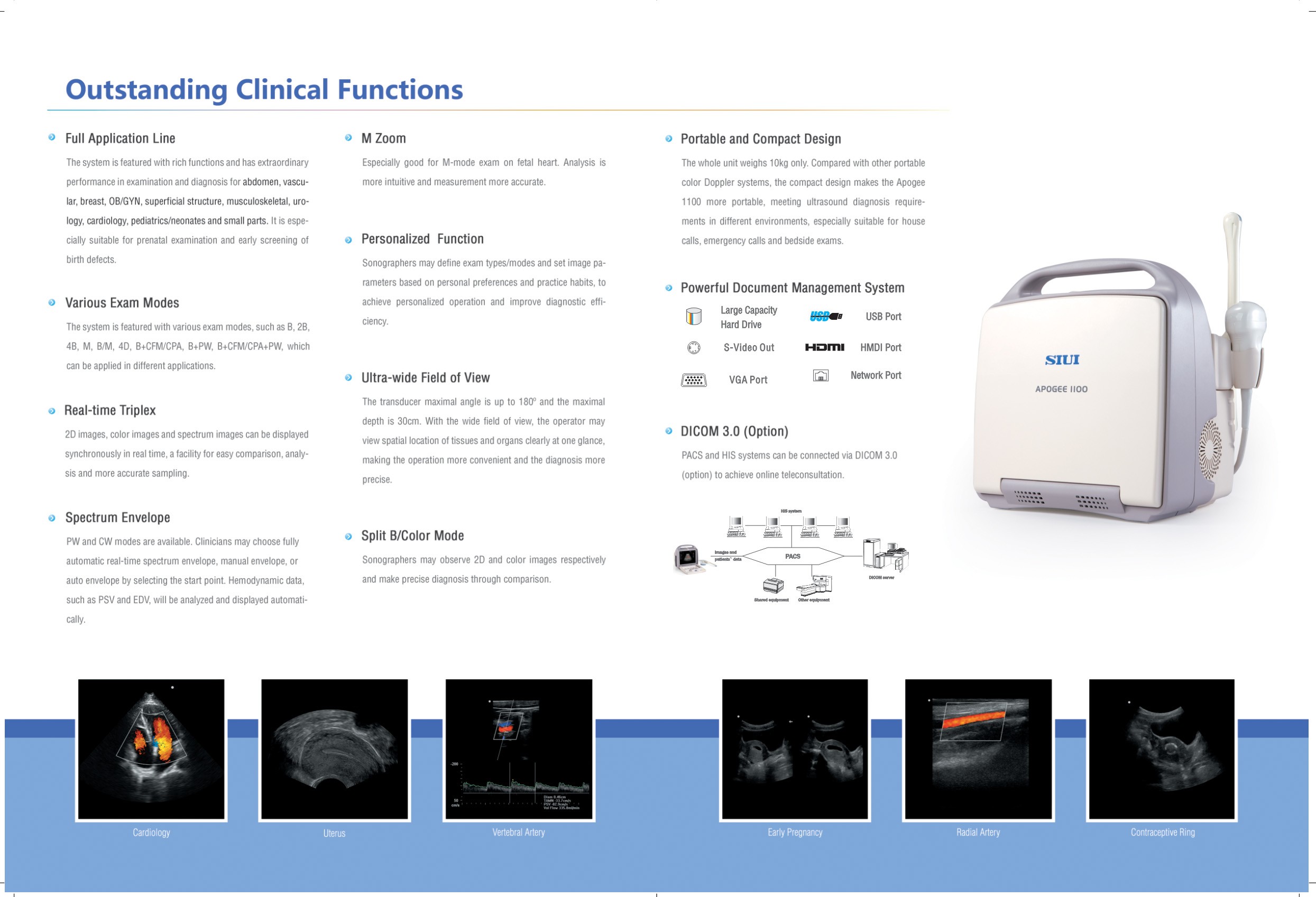 En la mayoría sistema de ultrasonido color doppler portátil, los diseñadores sacrifica la calidad de imagen para obtener la portabilidad del dispositivo. Con el lanzamiento de nuestro Apogee 1100 rompemos esa regla completamente. Nuestra tecnología avanzada, permite que un sistema portátil y compacto tenga la calidad de imagen y funciones de un sistema de ultrasonido estacionario de alta calidad.
