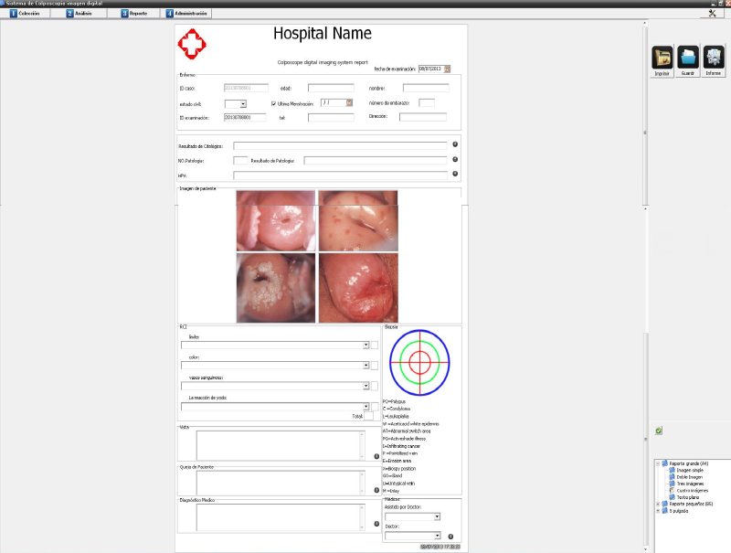 Elaboración de reporte de una forma facil y rapido, en el reporte incluye: indice de colposcopia Reid, diagrama del cervix, inserta imagen, resultado del laboratorios.