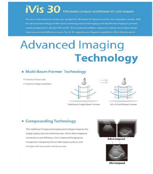 IVIS30 es un sistema de ultrasonido de alta calidad basado en tecnología PC, en combinación, con tecnologia más avanzada digital de imagen, tecnología de caracterización de imagen y tecnología de banda ancha, alta densidad en los transductor. Con todas estas caracteristicas avazadas este sistema de ultrasonido ofrece la imagen de diagnostico de alta definición. El sistema tambien tiene muchas funciones opcional tales como DICOM 3.0 y 4D. El sistema permite funciones definidas por usuario, sistema poderoso de manejo de reportes, paquete de análisis profesional, amplia seleción de transductores.